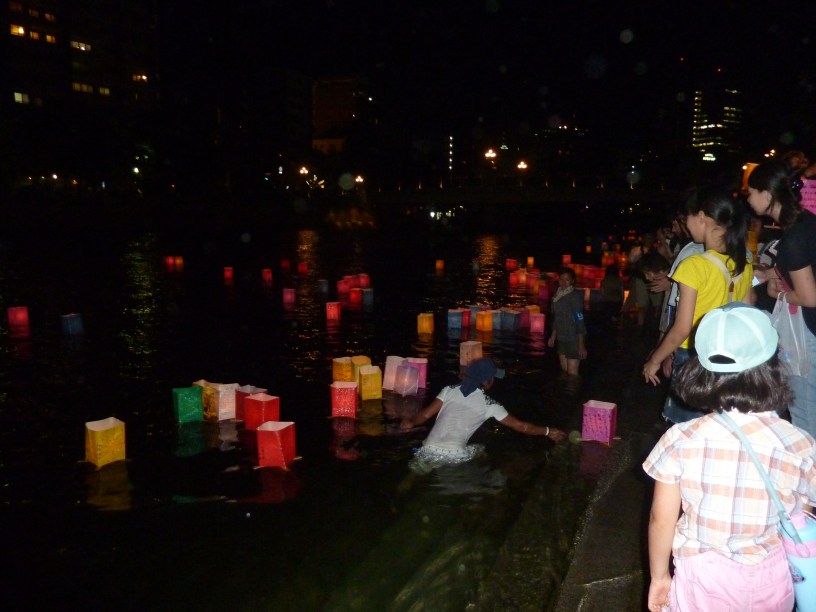 Les lanternes le soir du 6, lâchées sur la rivière avec des messages de paix