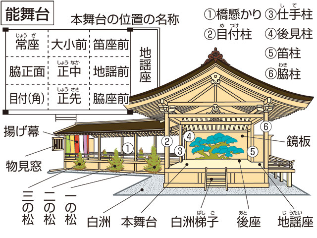 La scène (butai) est un plancher surélevé d’un mètre par rapport au sol, formant un carré dont les quatre angles représentent les points cardinaux. C’est dans ces quatre angles que prennent place les quatre piliers soutenant le toit de la scène. Les coulisses (gakuya) sont reliées à la scène par une passerelle (hashigakari).
