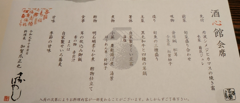 Champignons shimeji Tamba, fleurs de chrysanthèmes en gelée, persil mizuna, barracuda poêléAssortiment de légumes et poissons de saisonSoupe façon consommé, dorade rouge, champignon matsutake, branches de mizuna et zeste de yuzuSashimi de thon rouge, daurade royale, et sériole, sauces soja et pruneNabe de bœuf Wagyû aux quatre variétés de champignonsLa surprise d’anniversaire : le teppan-yaki de bœuf de Kobe !Tofu soyeux fait maisonNavet mijoté avec peau de lait de soja, épinards, yuzu, et gluten de millet frit awabuPoulpe tendre Akashi mijotéSoupe miso, riz aux champignons shimeji et tsukemonoNouilles froides de sarrasin maison zaru sobaSorbet au yuzu