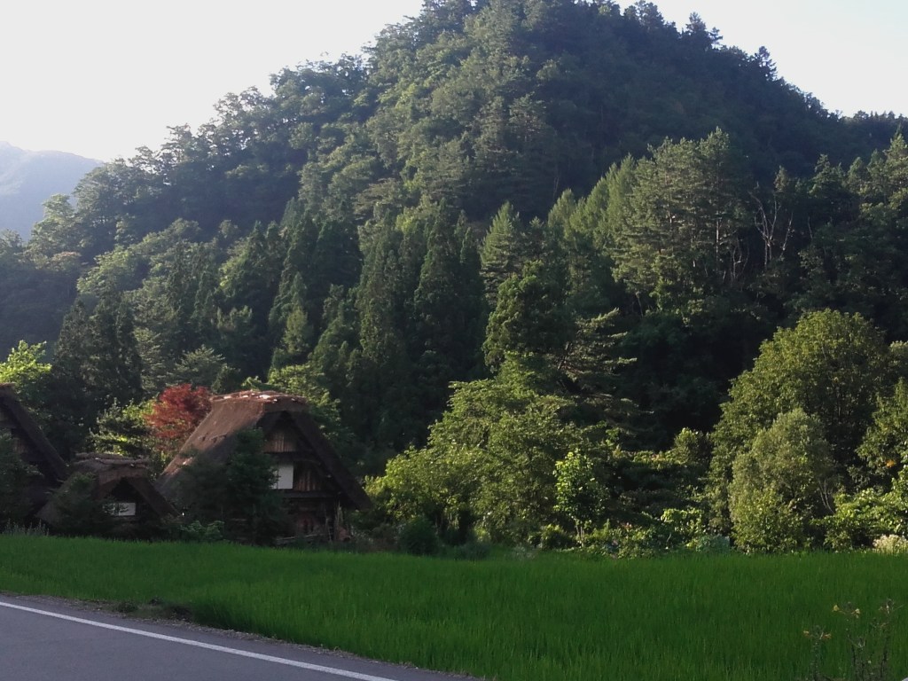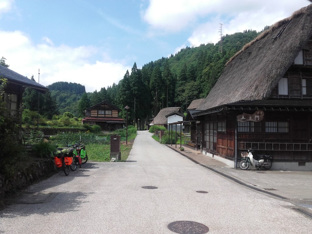 Dîner rapide sur une plaque d’égout et montage de tente dans le noir avant une nuit entrecoupée par le bruit des camions… Ah, les joies du camping amateur ! Ce matin, lever à 4h30 pour tenter les 68kms jusqu’à Shirakawago. Une heure pour sécher les tentes/vélos /housses à cause de la rosée, puis 7kms d’entrée en pente à 5,5%, ça réveille ! La suite : une route magnifique bordée de rizières, puis longeant un fleuve en longue descente douce.