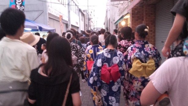 Arrivés il y a deux jours à Matsuyama, nous sommes de suite rentrés dans le bain avec un grand matsuri et son feu d’artifice au bord de mer. Des tonnes de stands étaient disposés dans les rues pour manger sur place et des milliers de personnes étaient venues spécialement pour l’événement. Les jeunes étaient tous habillés en yukata pour l’occasion, et les geta (sandales) claquaient sur le sol tout le long de la route.