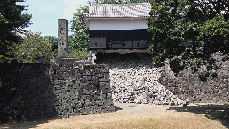 La région a vraiment été sévèrement touchée. De nombreuses routes sont fissurées, en partie effondrées, des pans de montagne entiers sont tombés, plein de maisons se sont écroulées ou sont trop abîmées pour être habitées… c’est assez impressionnant à voir ! Du coup, nous étions un peu gênés d’arriver en touristes au milieu de cette préfecture marquée par la catastrophe, mais nous avons ressenti beaucoup de gentillesse de la part des habitants qui ne nous voyaient pas du tout d’un mauvais œil, et étaient même désolés pour nous que nous ne puissions voir le château aussi beau qu’il était avant le séisme. Par pudeur pour les habitants, je ne montre qu’une seule photo d’un mur d’enceinte du château pour donner une idée.