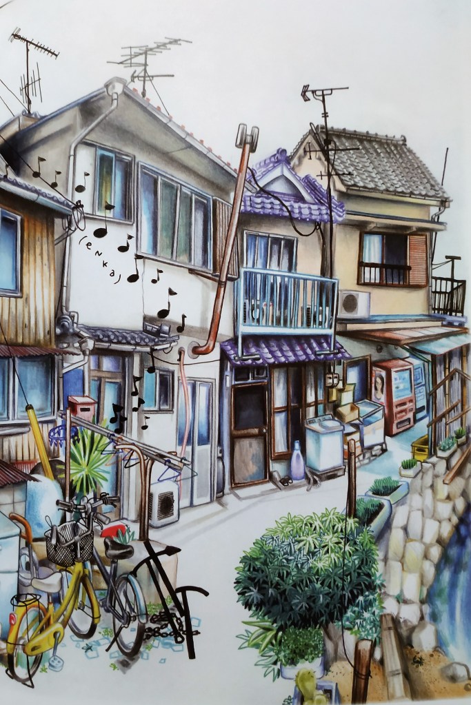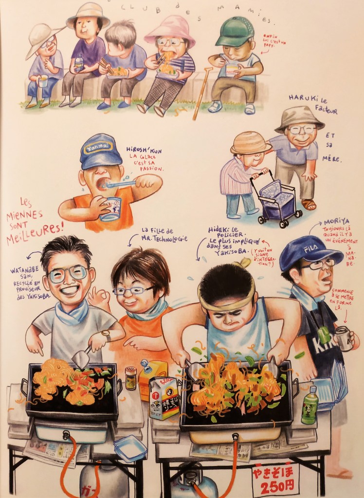 Nous partons donc en sa compagnie à la découverte des habitants de l’île (humains comme animaux!), mais aussi de sa culture populaire, de ses fêtes, de ses traditions. Le matsuri de l’île et ses courses effrénées en portant le mikoshi (autel shinto), la journée de la mer en compagnie d’un spécialiste et avec les enfants de l’île, les feux d’artifices par les enfants bêtes et courageux, la fête des enfants et ses nouilles, son bingo, et autres festivités,… Ce sont deux mois de découverte d’un Japon rural plein de couleurs et de surprises !