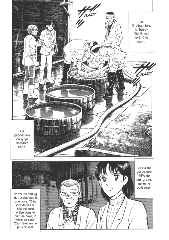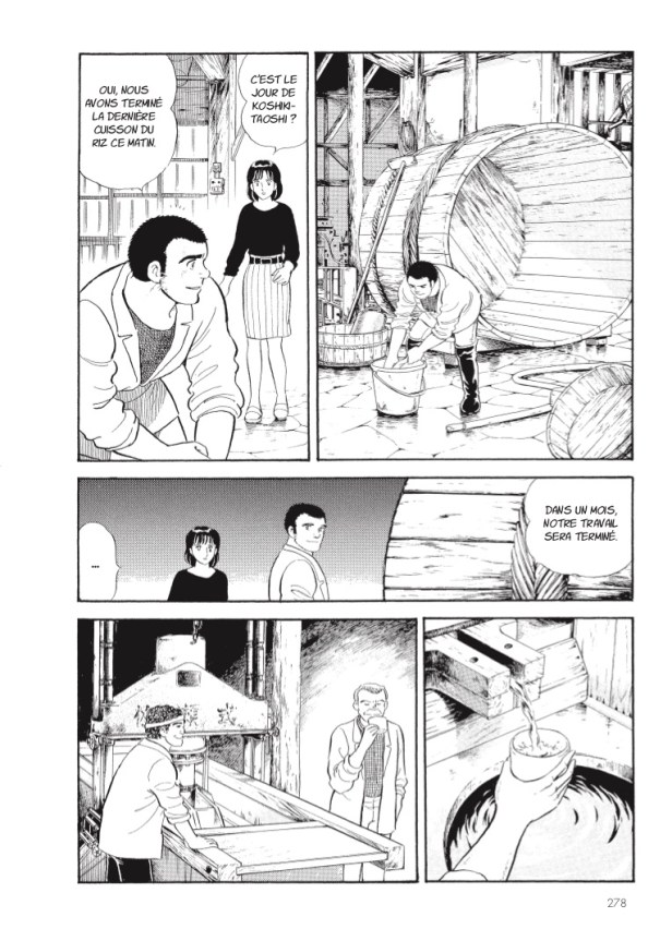 Mais ce manga ne se contente pas d’être seulement très complet en ce qui concerne le saké. Il est également très intéressant au niveau du dessin et du rythme de la narration (j’aime beaucoup cette ambiance un peu ancienne de la fin de l’ère Shôwa et le souci du détail dans les scènes de la kura et des rizières), et surtout incroyablement actuel dans ses thématiques abordées.