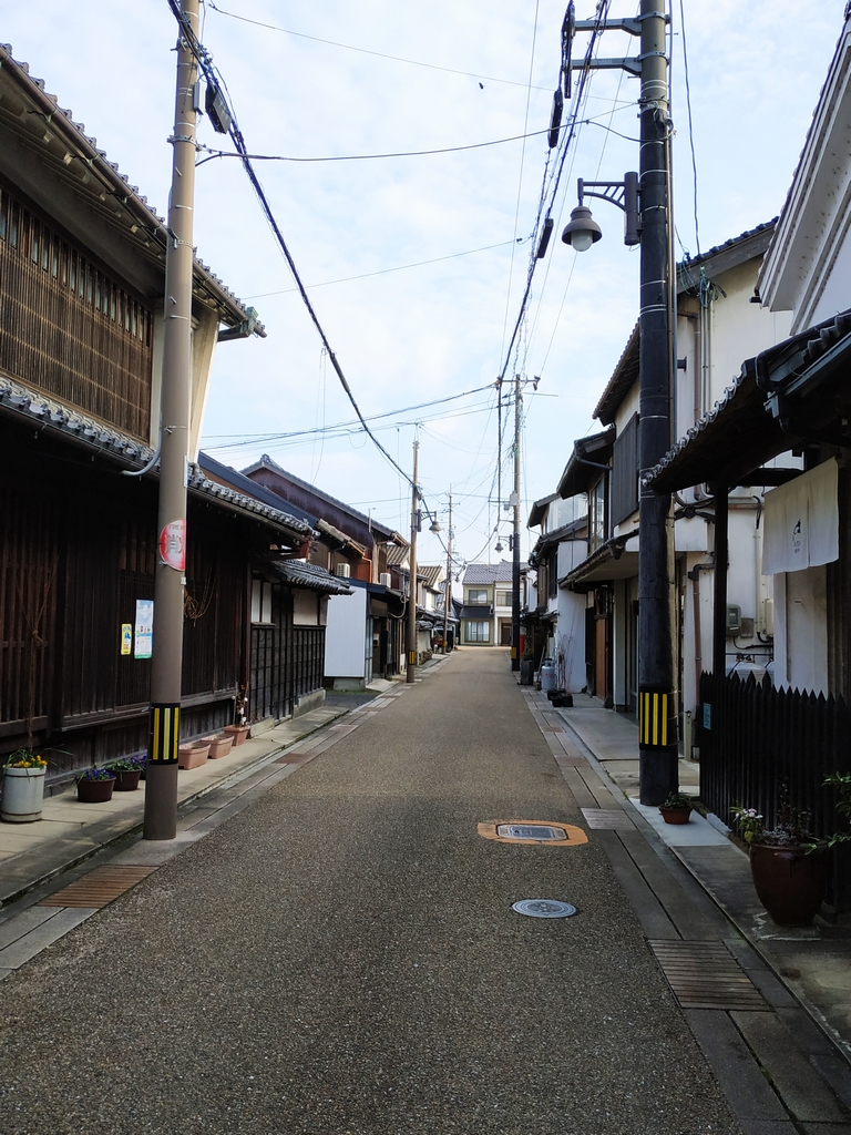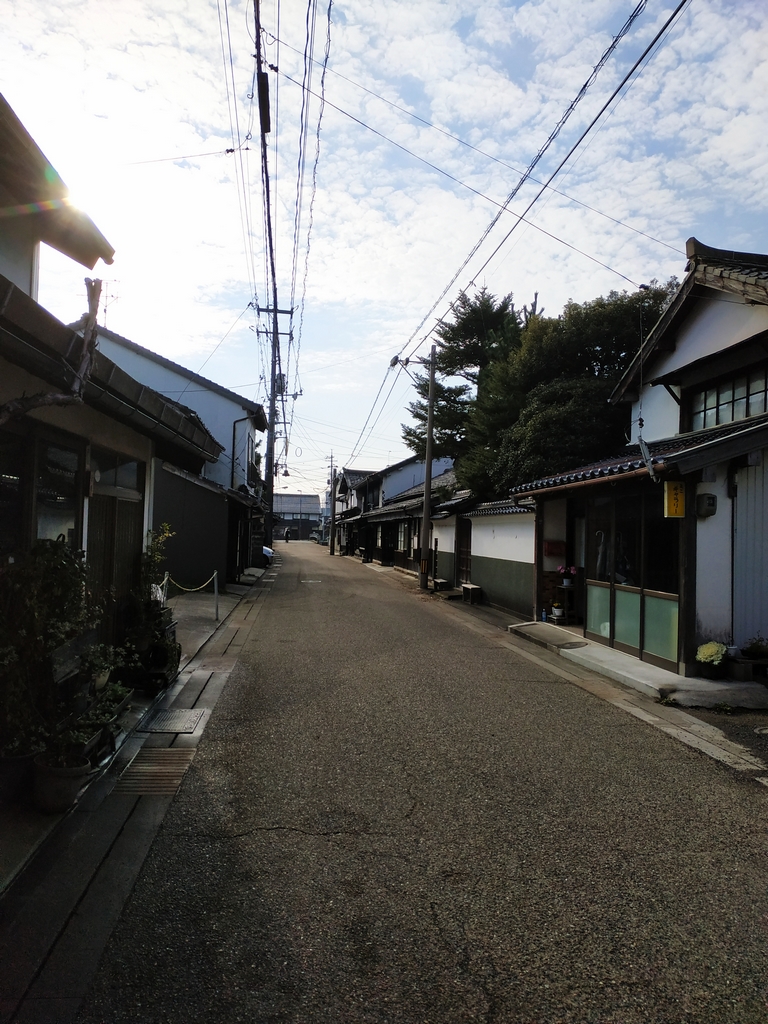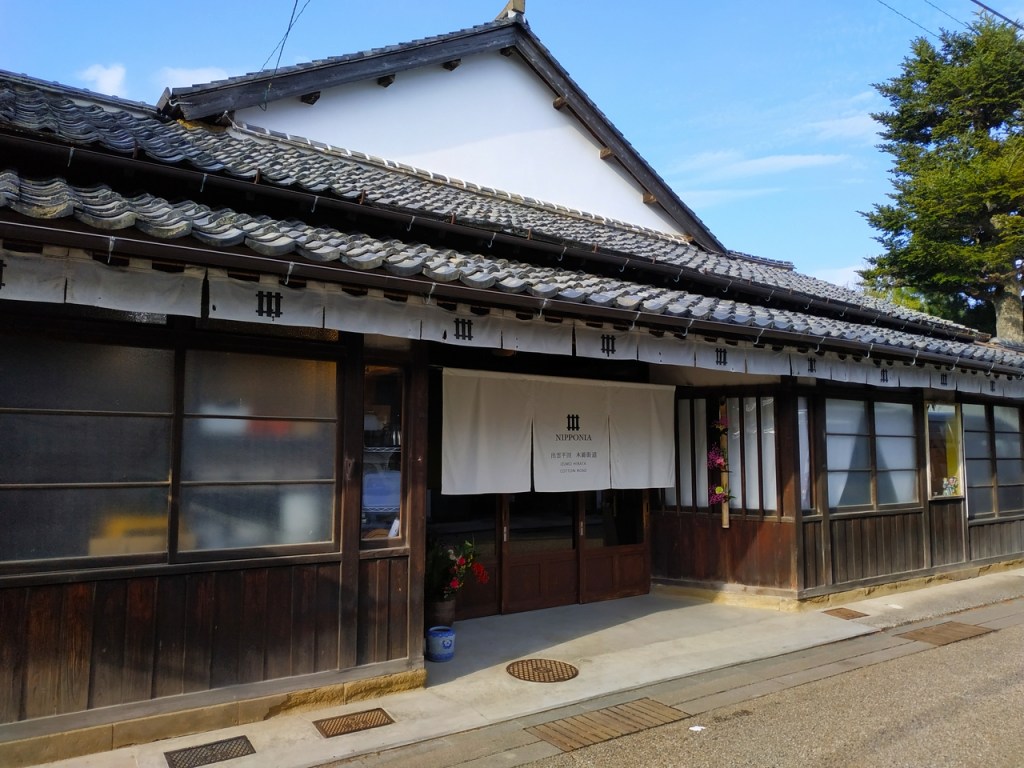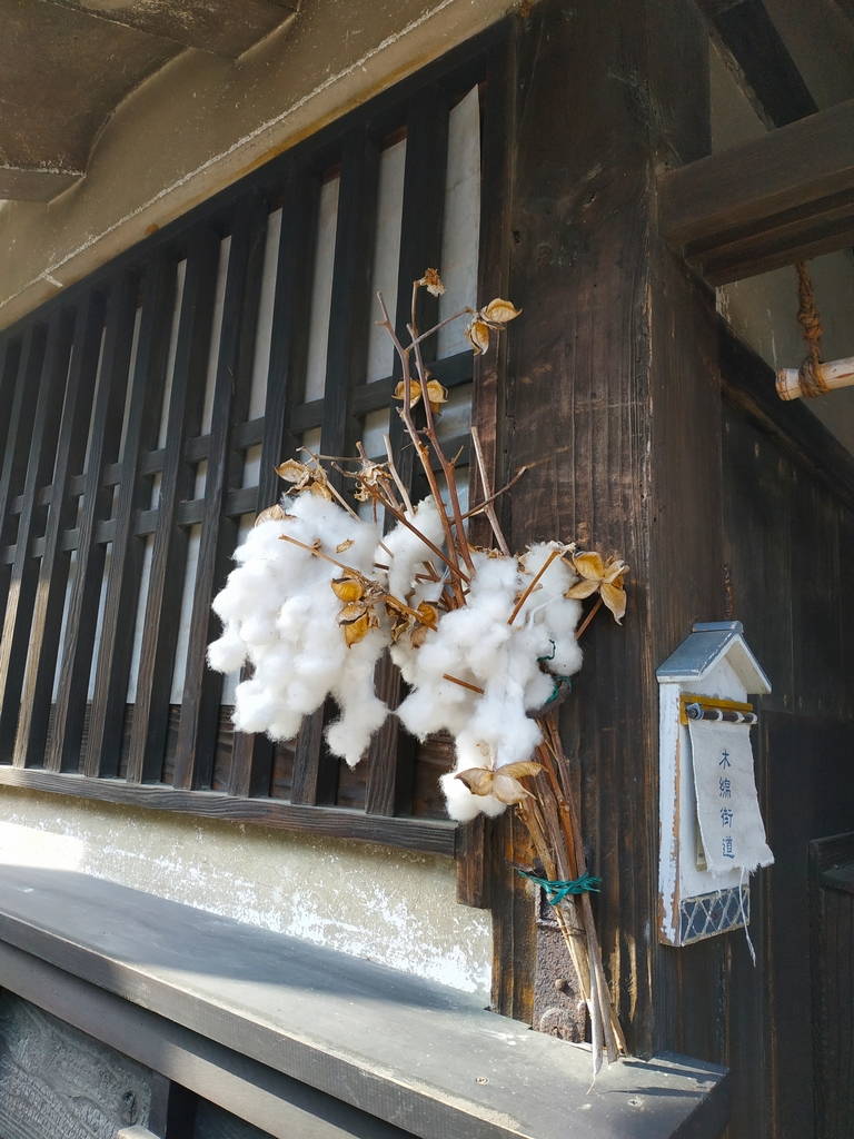 Me voici donc arrivé à Hirata pour les visites de Momen Kaidô (la route du coton). Ici se trouve une très belle rue historique préservée en forme de L, dans laquelle de nombreux magasins de marchands sont installés depuis plusieurs siècles. Grâce à un environnement naturel riche et au canal qui la relie au lac Shinji, la ville a prospéré au cours du 18ème siècle, permettant aux marchands de développer une production de produits locaux de qualité. La plupart des maisons qui se trouvent dans la rue historique paraissent étroites mais sont en réalité assez profondes et servent encore actuellement d’ateliers, de fabriques, d’entrepôts pour les productions locales, et donnent de l’autre côté sur la rivière.