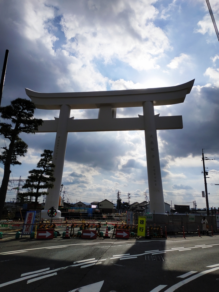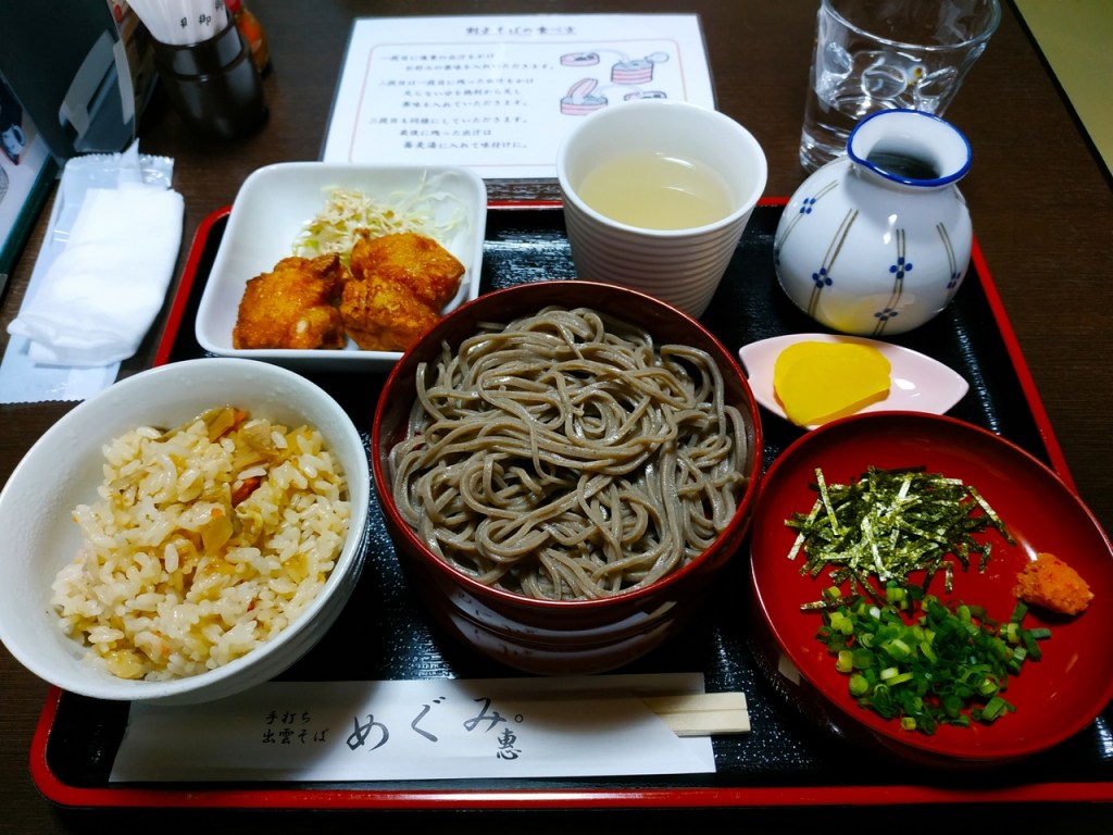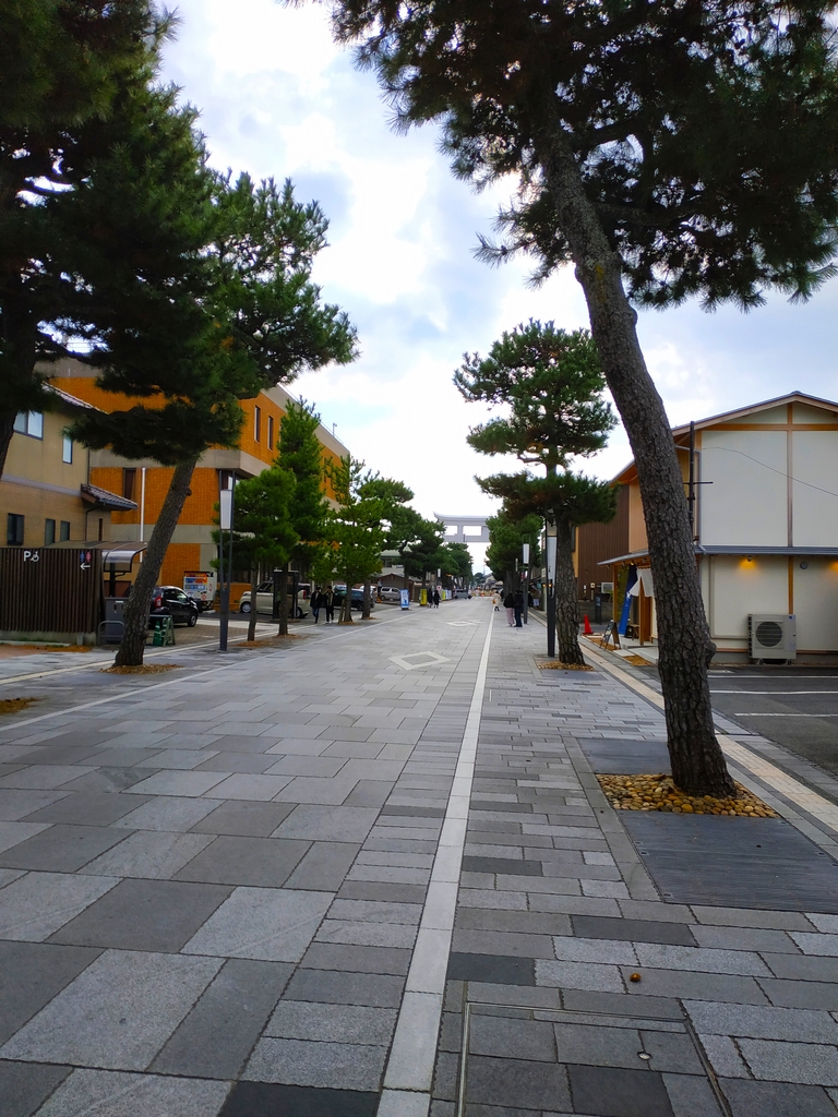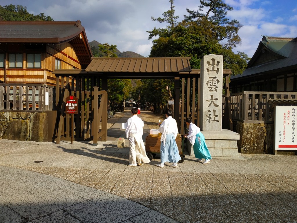 Retour à la gare en fin de matinée pour me diriger vers la ville d’Izumo, avec une idée en tête : manger les fameux Izumo soba, spécialité locale. En sortant de cette magnifique gare, on se retrouve directement dans la rue Shinmon-dôri, une très jolie rue commerçante menant au grand sanctuaire. Après un petit tour au grand torii de 23 mètres de haut (ici dans les travaux), je rentre dans le restaurant Megumi qui me propose un magnifique plateau repas de gourmet voyageur ! Une pause gastronomique bien méritée avant de retrouver Angie et son supérieur qui sont venus tous les deux pour me guider.