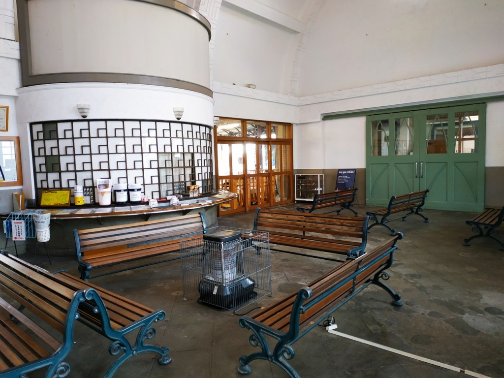 La gare terminus d’Izumo est, elle aussi, absolument incroyable. Le hall nous plonge dans le passé avec son ambiance rétro et chaleureuse. Je m’assois quelques instants sur les bancs tournés vers le poêle, réchauffé autant par la tiédeur ambiante que par la douce nostalgie qui émane de ce lieu. On se croirait dans un de ces anime où le personnage regagne sa campagne natale en train et traverse des endroits de plus en plus figés dans le passé !