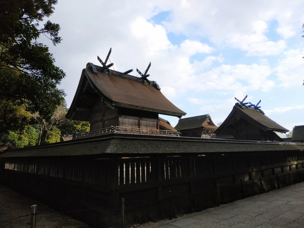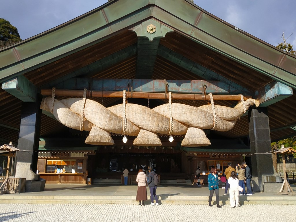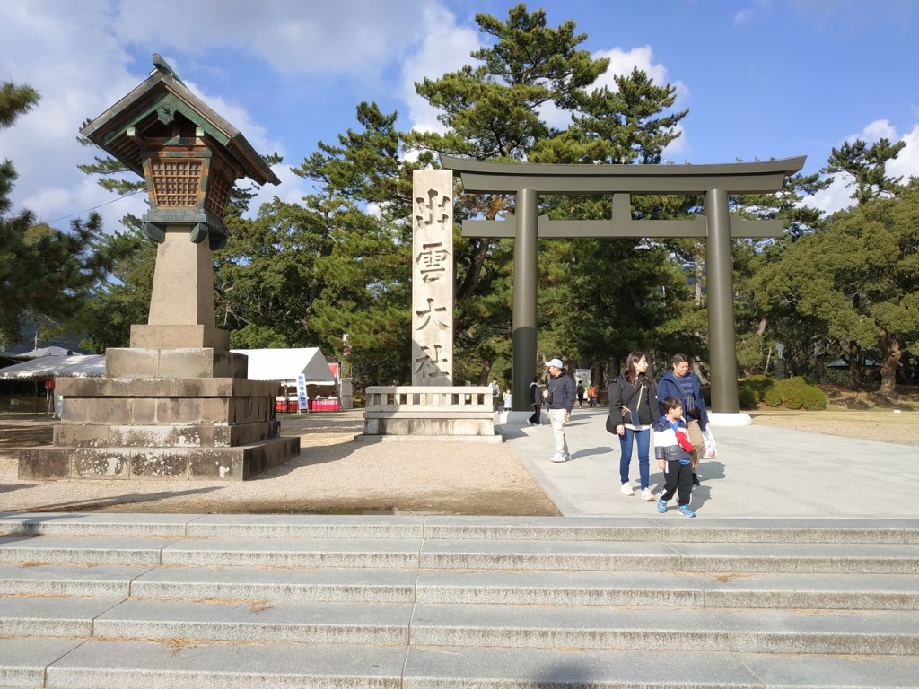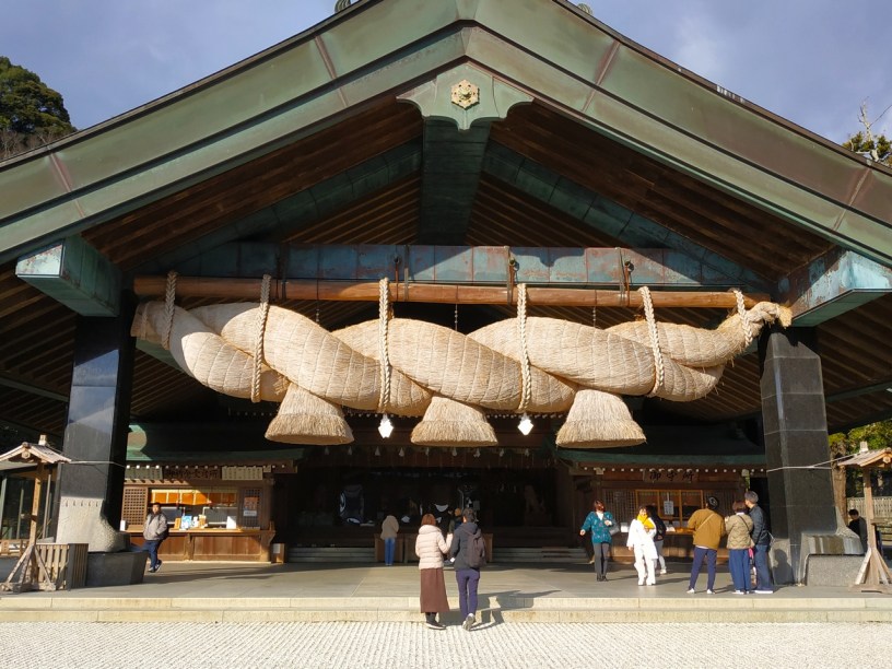 Izumo est connu au Japon comme étant le Royaume des Dieux. Le grand sanctuaire Izumo Taisha est le deuxième plus important du Japon après celui d’Ise, et le plus grand bâtiment shinto du pays. Il mesure 24 mètres de haut, mais des fouilles archéologiques prouvent qu’il mesurait auparavant 48 mètres de haut (voir la photo des emplacements des anciens piliers – qui semblaient énormes). Son origine remonte au 8ème siècle, et il est mondialement connu pour la grande corde tressée shimenawa de plus de 5 tonnes. Le 10ème jour du 10ème mois de l’ancien calendrier lunaire, les kami de tout le Japon s’y retrouvent en séminaire pour discuter de l’année à venir. La divinité qui y est vénérée s’appelle Okuninushi-no-okami.