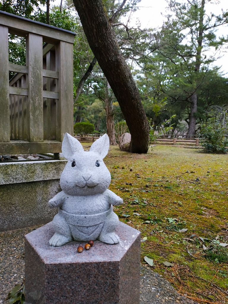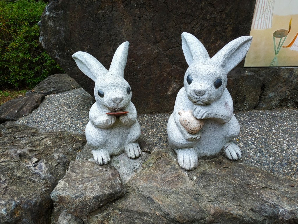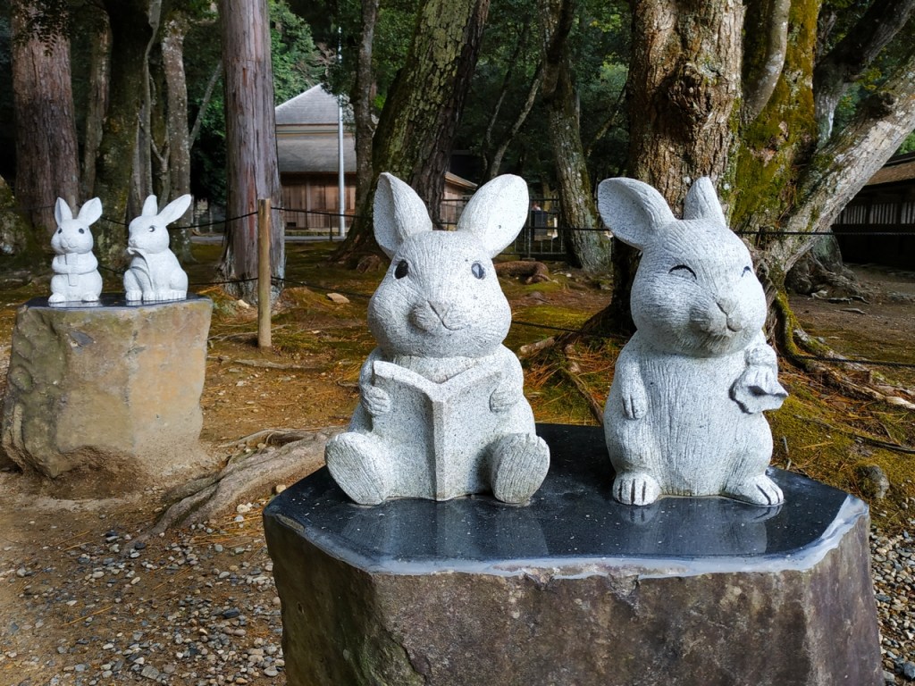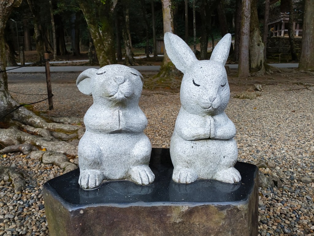Un jour, Okuninushi et ses frères se rendirent dans les terres d’Inaba pour séduire une princesse. Sur leur chemin, croisant un lapin sans poil avec la peau à vif, les frères furent cruels tandis qu’Okuninushi lui expliqua comment guérir. Ce lapin s’avérant être un envoyé des dieux, il s’assura que la princesse choisisse Okuninushi comme mari. Izumo Taisha est rempli de petites statues de lapins, comme vous pourrez le voir dans les photos suivantes !