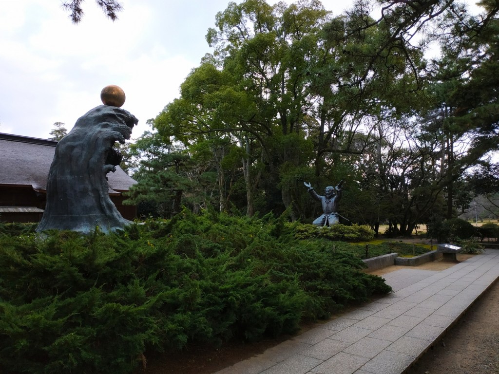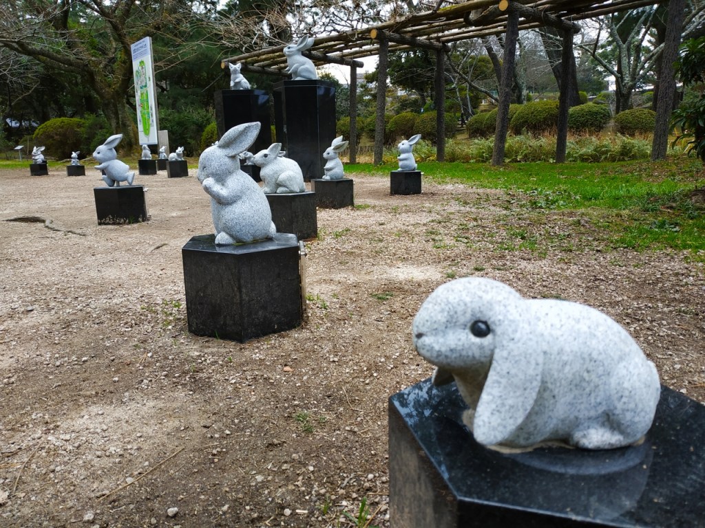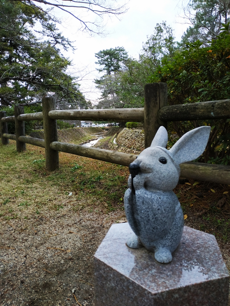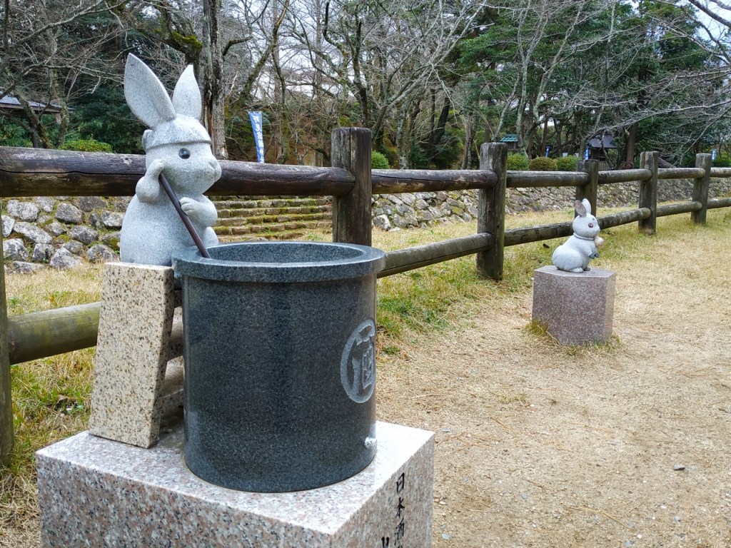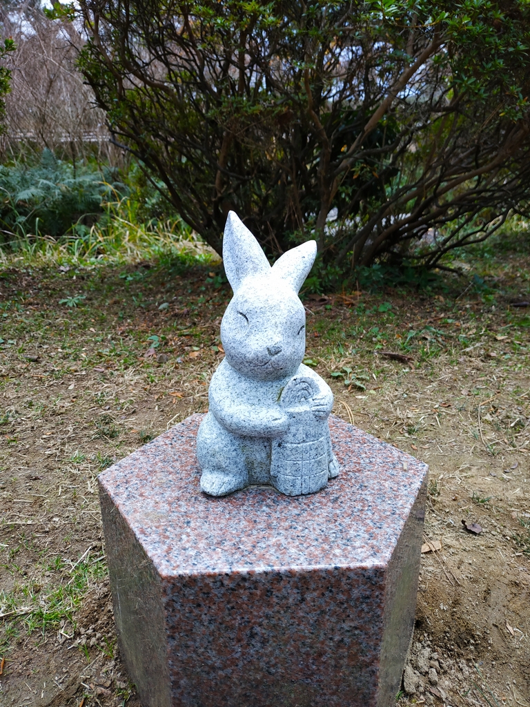Un jour, Okuninushi et ses frères se rendirent dans les terres d’Inaba pour séduire une princesse. Sur leur chemin, croisant un lapin sans poil avec la peau à vif, les frères furent cruels tandis qu’Okuninushi lui expliqua comment guérir. Ce lapin s’avérant être un envoyé des dieux, il s’assura que la princesse choisisse Okuninushi comme mari. Izumo Taisha est rempli de petites statues de lapins, comme vous pourrez le voir dans les photos suivantes !