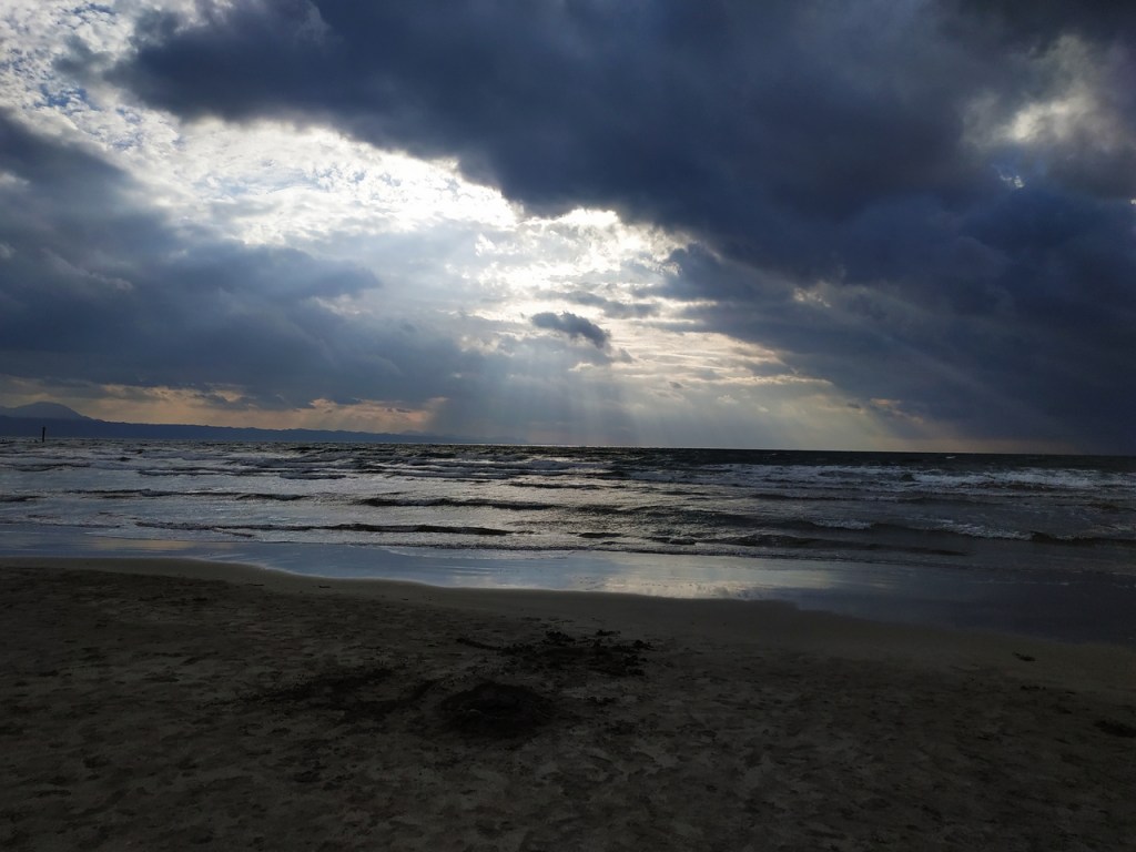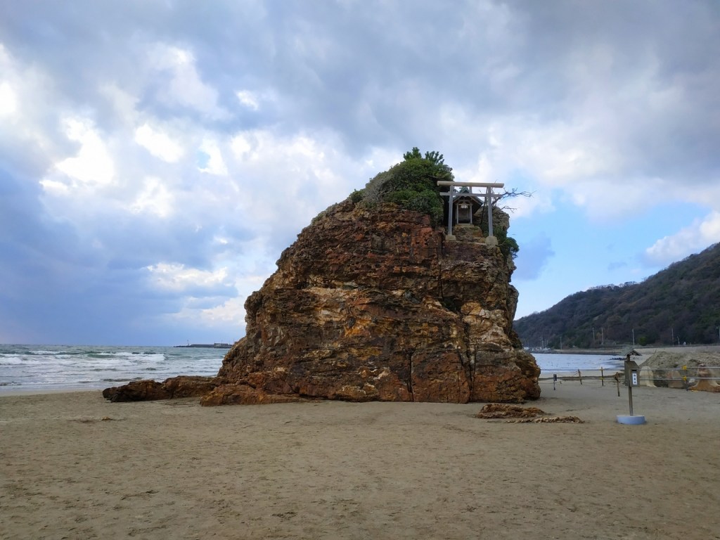 Arrivé sur la plage, c’est un superbe paysage qui s’offre à mes yeux ! Le ciel nuageux est transpercé par une multitude de rayons du soleil, comme si la déesse Amaterasu m’offrait son plus beau cadeau de bienvenue sur ses terres. L’imposant rocher surmonté d’un petit sanctuaire nommé Benten-Jima protège les marins partis en mer et donne une sensation toute particulière à cette plage par laquelle tous les kami arrivent pour se réunir à Izumo Taisha. Inasa no hama est véritablement un endroit magique !