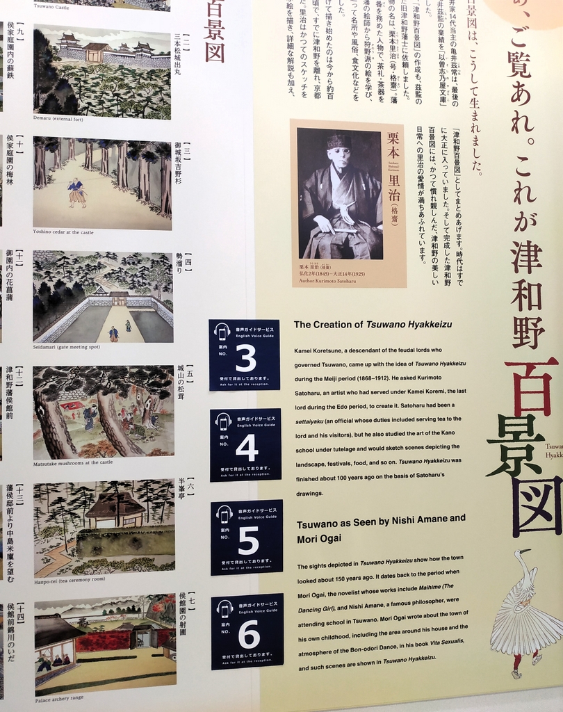 Pendant l’ère Meiji, Kamei Koretsune demanda à ce qu’un ancien serviteur de Tsuwano créé une série de peintures représentant les endroits remarquables du domaine. Ce fut Kurimoto Satoharu, artiste et ancien responsable de cérémonie du thé, qui s’en chargea. Il parcourut Tsuwano en dessinant des esquisses d’endroits, coutumes, plats,… pour créer le Tsuwano Hyakkeizu par la suite (série de 100 vues de Tsuwano). Son travail est absolument impressionnant, et de nombreux paysages sont toujours observables de nos jours, montrant toute la détermination des habitants de la ville pour maintenir Tsuwano au plus proche de ce qu’elle était à cette époque.