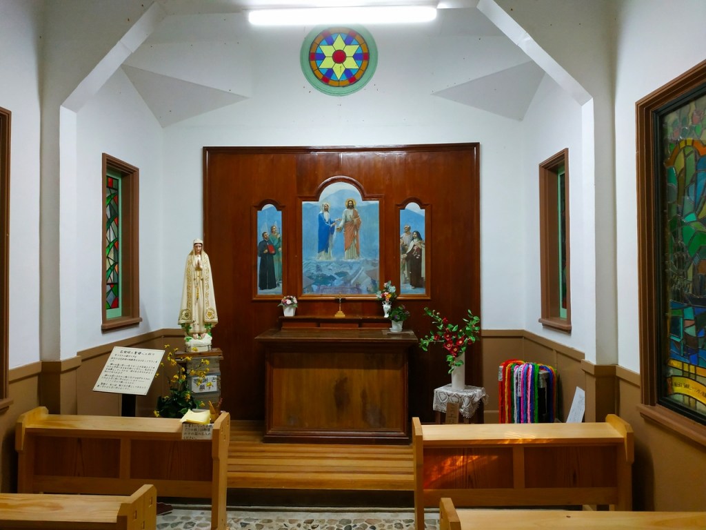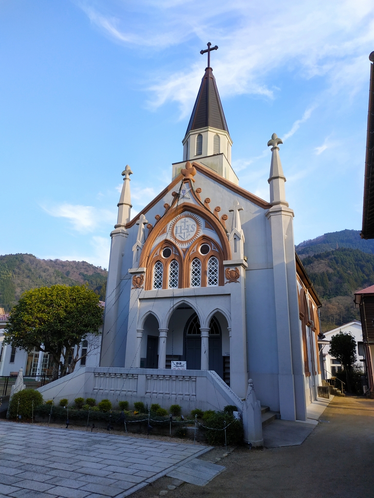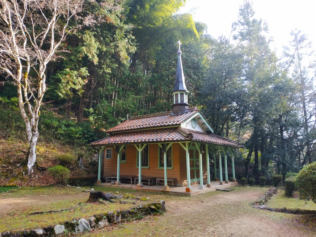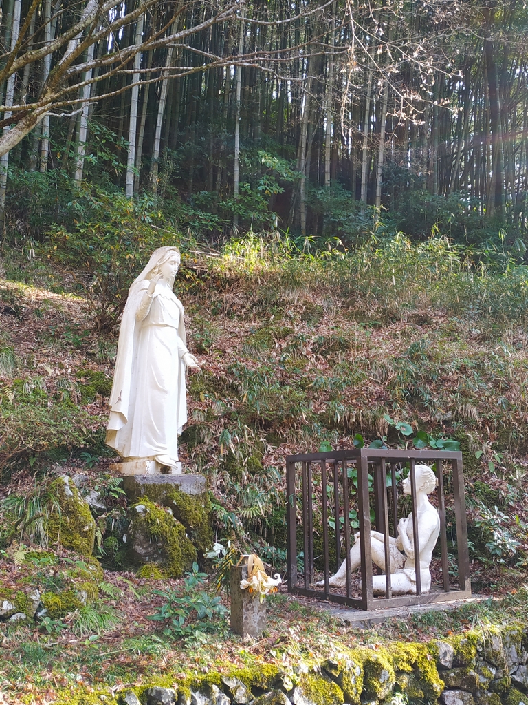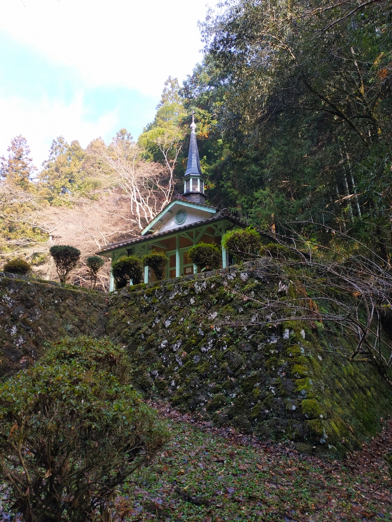 Après une jolie petite pente pour dégourdir les jambes qui ont bien pédalé la veille, me voici dans une clairière aménagée où se trouve la chapelle Sainte Marie Otome Tôge (le Col de la Vierge), un bâtiment commémoratif en mémoire des martyrs chrétiens de Tsuwano.