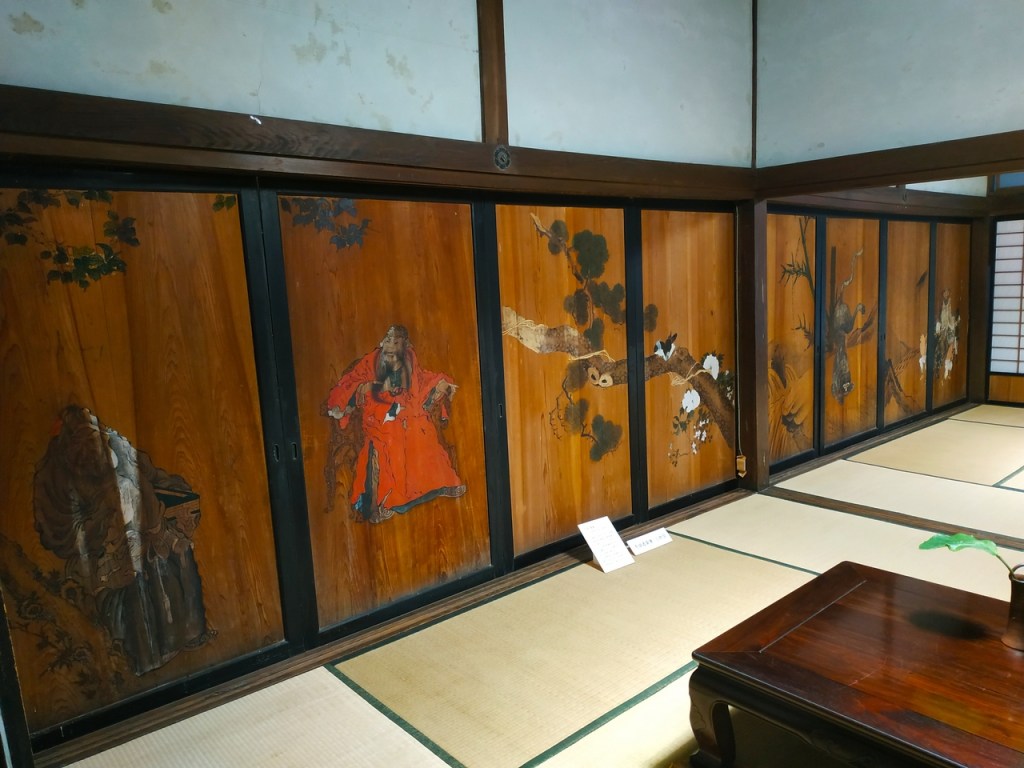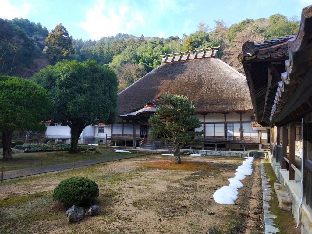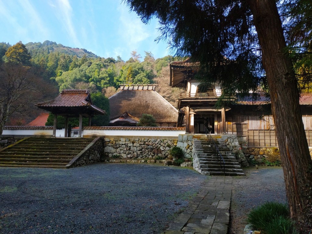 L’immense toit de chaume est très impressionnant, et sa visite est intéressante grâce aux nombreux couloirs et salles qui regorgent de peintures, sculptures, portes décorées, montrant la richesse des familles qui l’occupèrent pendant plusieurs siècles. Le jardin japonais privé du temple est magnifique, avec la montagne comme fond et la source qui en vient directement.
