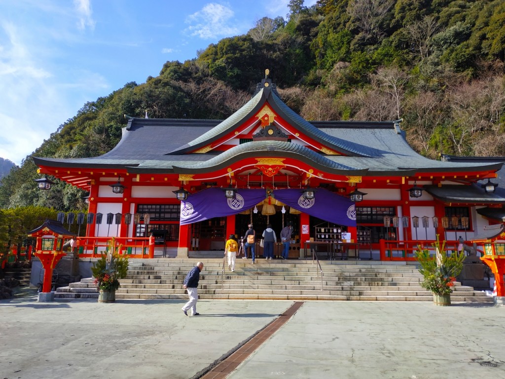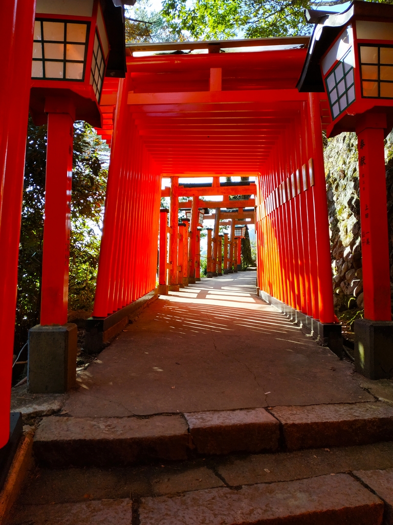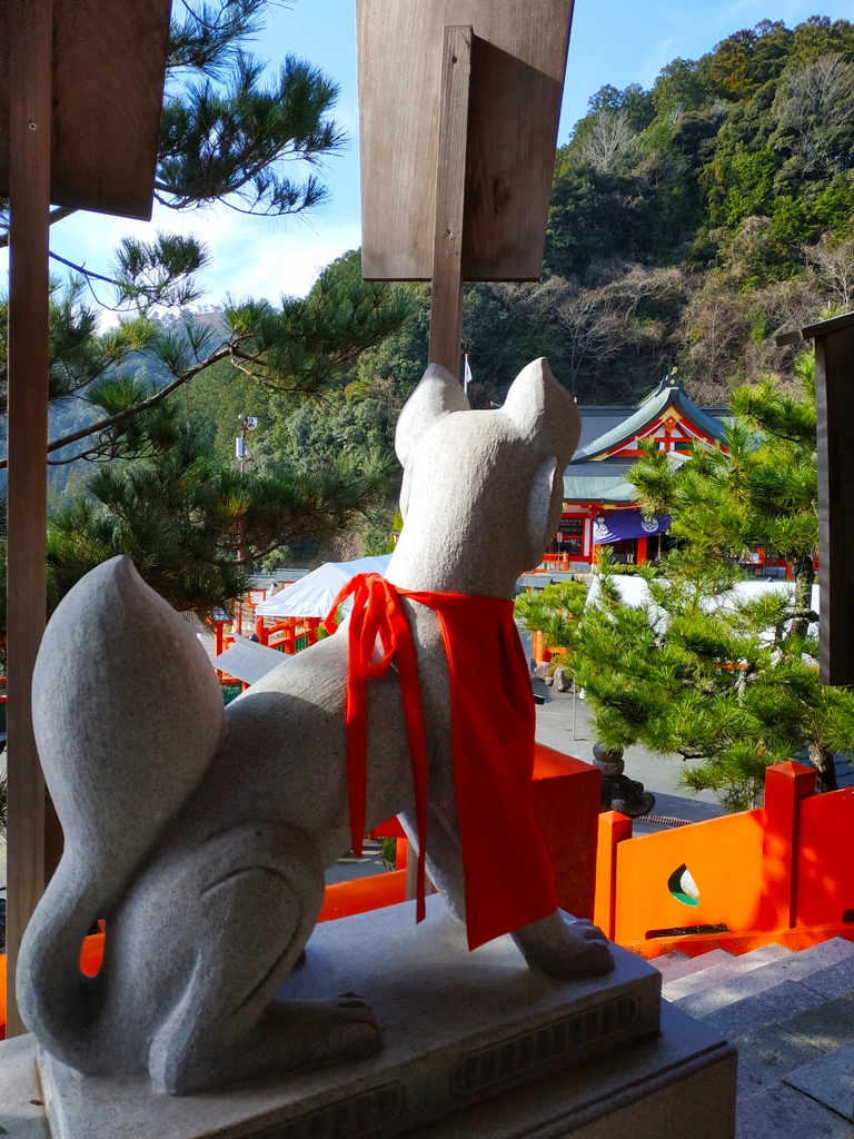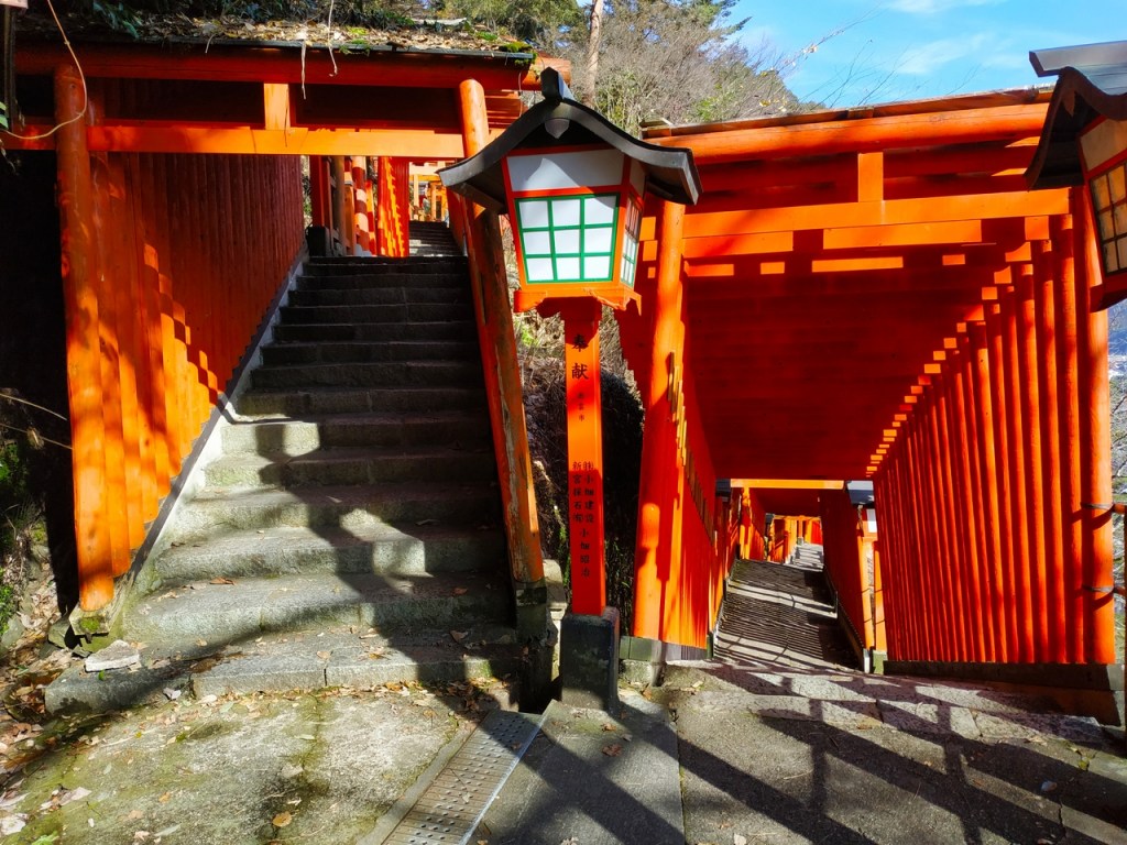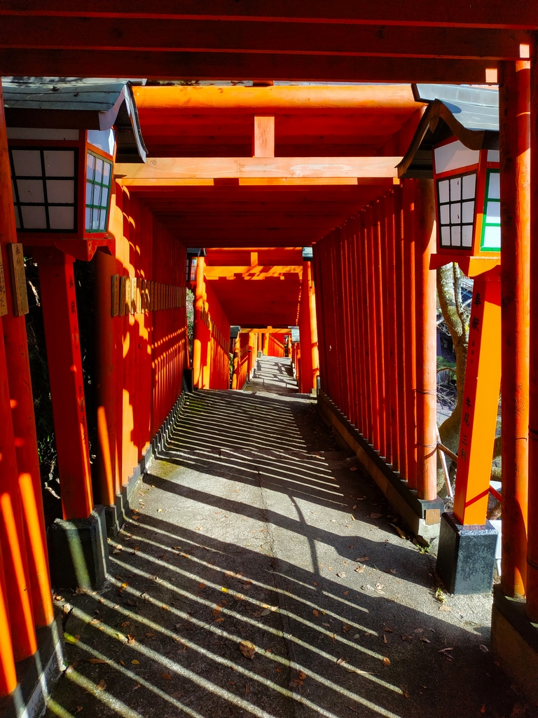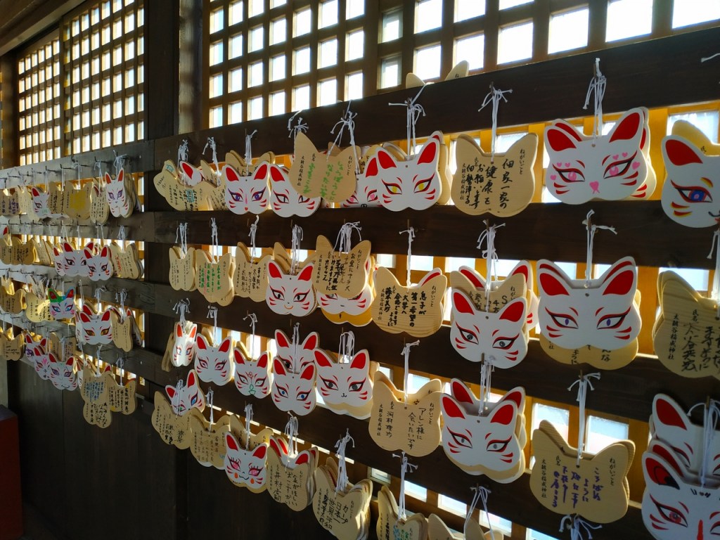 Pour s’y rendre, on peut emprunter un chemin typique des sanctuaires Inari à flan de montagne. Un millier de portiques torii serpentent de la ville au sanctuaire, offrant une promenade mystique dans une très belle luminosité matinale et ensoleillée. Il me faut seulement une quinzaine de minutes de montée pour arriver au bâtiment principal malgré les nombreux arrêt-photos, et je tombe en pleine cérémonie avec de la musique de gagaku, les sons des cloches secouées par les visiteurs qui se recueillent, les tapes dans les mains avant la prière, quelques cris d’enfants… Le sanctuaire n’est pas bondé, mais l’approche du nouvel an avec son lot de porte-bonheurs à rapporter et acheter entraîne une sorte d’effervescence joyeuse et colorée qui me ravit. J’aime vraiment les sanctuaires !