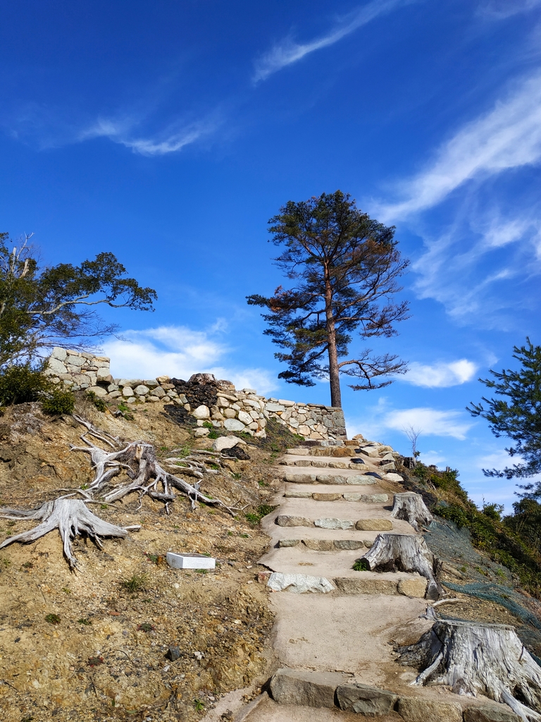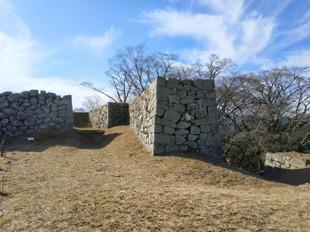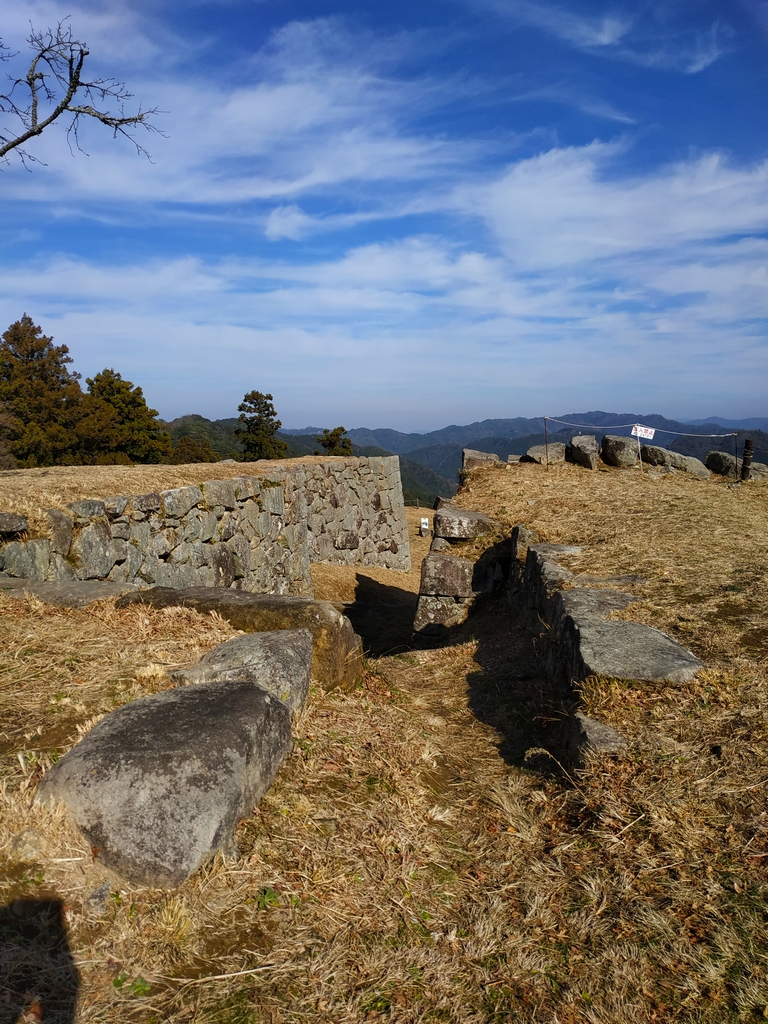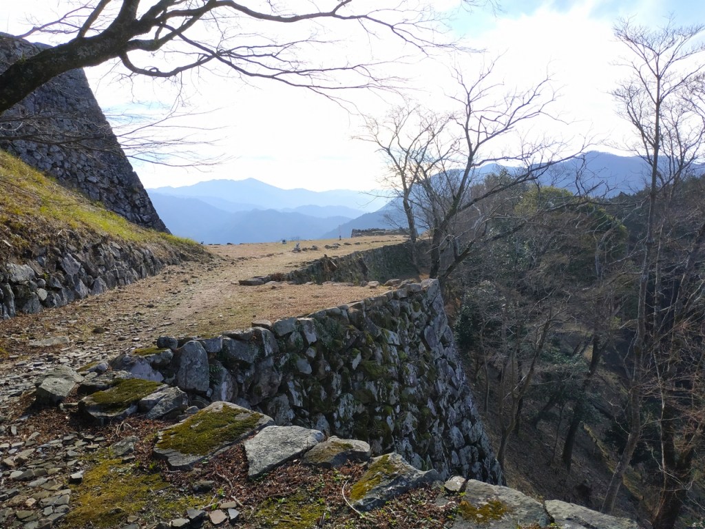 Arrivé au sommet de cette petite montagne, je découvre à la fois les ruines du château et le magnifique panorama sur la vallée de Tsuwano. Construit en 1282 par Yoshimi Yoriyuki pour défendre le domaine contre d’éventuelles nouvelles invasions mongoles (les deux tentatives de 1274 et 1281 avaient marqué les esprits des Japonais), il fut dirigé par son clan jusqu’en 1600. La défaite du clan Môri, auquel le clan Yoshimi avait juré fidélité, à la bataille de Sekigahara (voir article sur Hagi) mena à la perte du domaine de Tsuwano. Il revint à Sakazaki Naomori, un des généraux de Tokugawa Ieyasu, qui rénova et aménagea le château tout en construisant un nouveau donjon externe et en transformant la ville en ville-château jôka-machi. A noter que la résidence du daimyô et les bureaux administratifs étaient situés au pied de la montagne, afin d’éviter les difficultés liées aux sentiers escarpés.