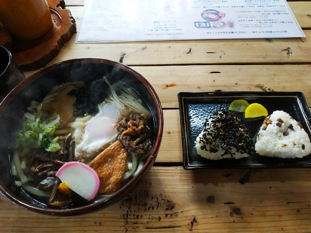 Après cette matinée très riche en histoire et en découvertes, je redescend de la montagne par le sentier emprunté à l’aller, puis par le Taikodani Inari Jinja en profitant une nouvelle fois du millier de torii. Après avoir grimpé dans la forêt pour chacune des quatre visites matinales, il est temps de regagner le centre et de trouver un endroit pour me restaurer. C’est chose faite au très mignon restaurant Minoya, où j’opte pour le menu Shikotama udon omusubi teishoku, soit un bol de nouilles avec plein d’ingrédients locaux et deux onigiri, le tout très bon et servi avec un grand sourire !
