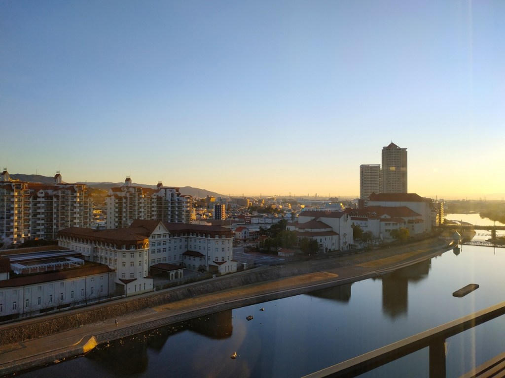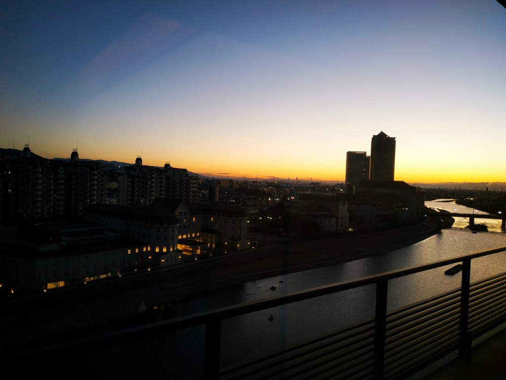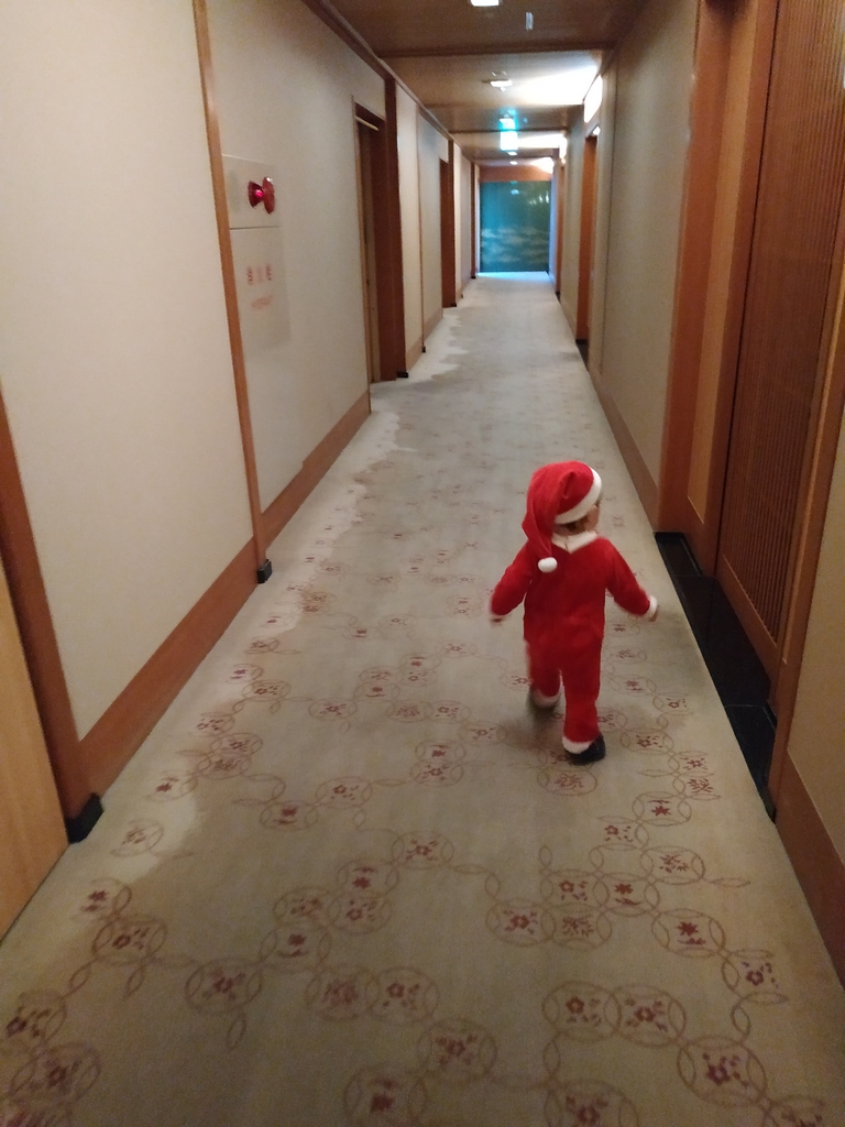 Le lendemain matin, on se lève aux aurores afin de profiter du onsen avant le petit-déjeuner, en compagnie d’un magnifique temps et d’un non moins splendide lever de soleil. Tout comme le repas du soir, le petit-déjeuner est très bon, bien que légèrement en-dessous d’autres ryokan dans lesquels j’ai pu aller auparavant. Notre petit garçon de 15 mois a eu énormément de succès avec sa tenue de Père Noël, toutes les mamies sont sorties de la cuisine pour le voir trotter à travers la salle à manger et les couloirs de l’hôtel (la photo n’est pas la meilleure, mais c’est la seule où on ne voit pas son visage) !!
