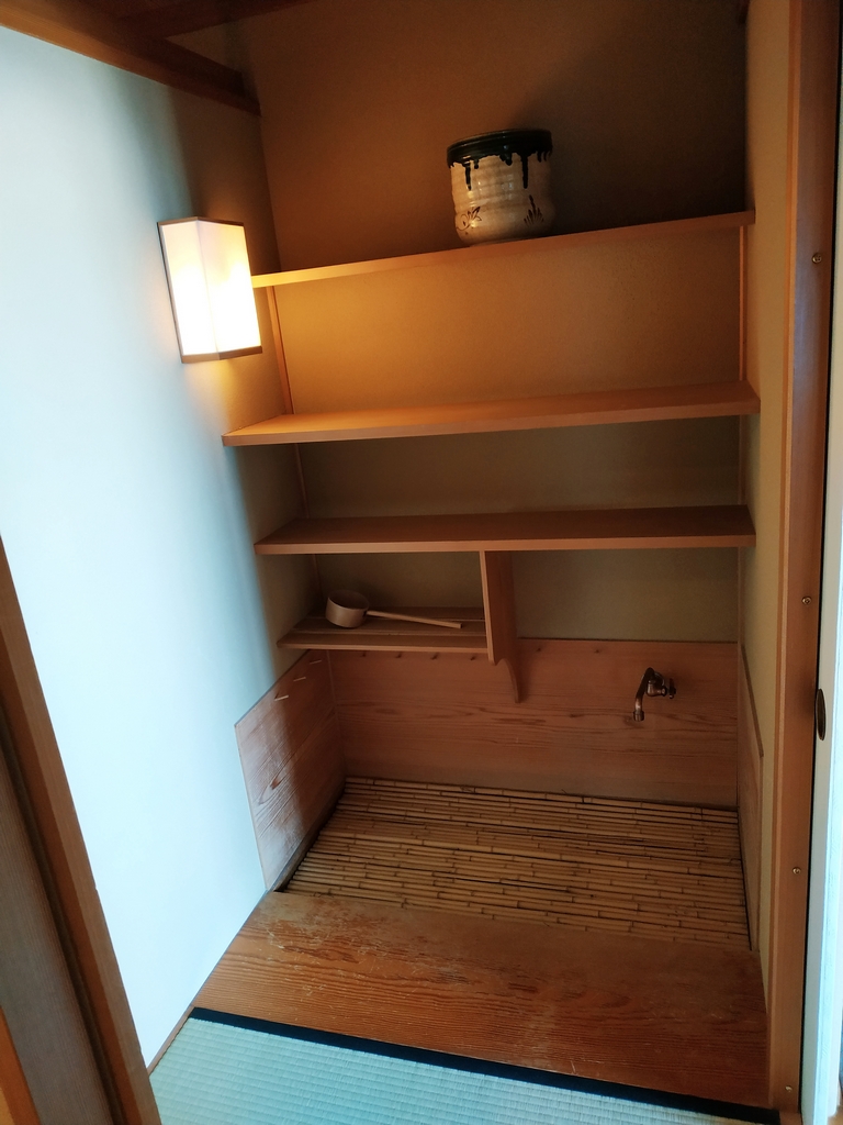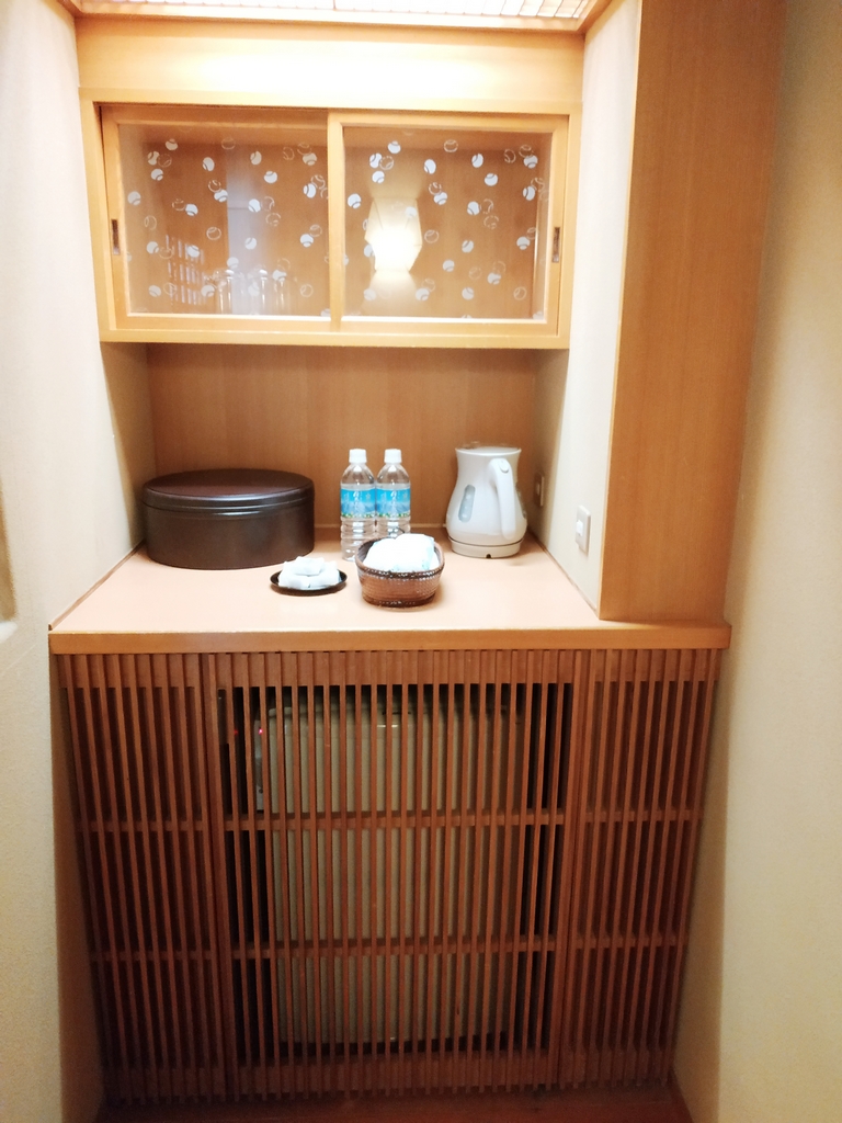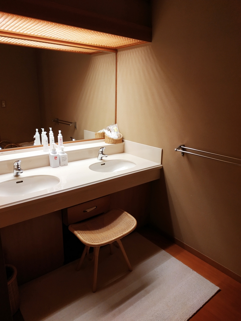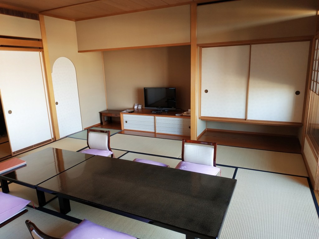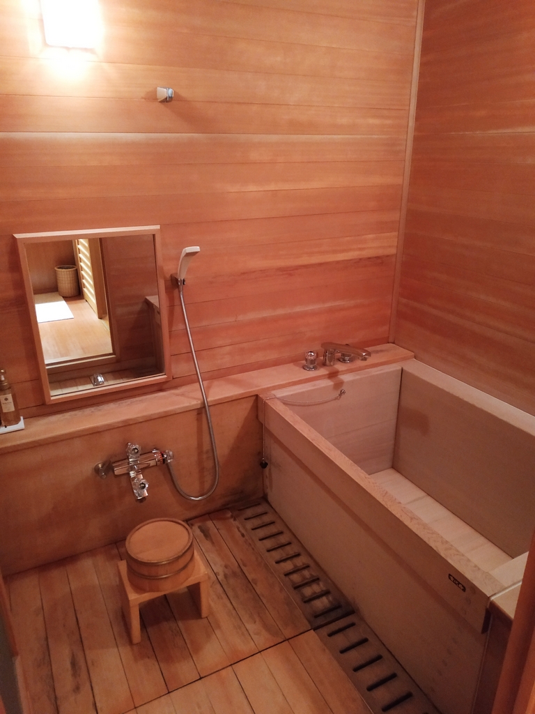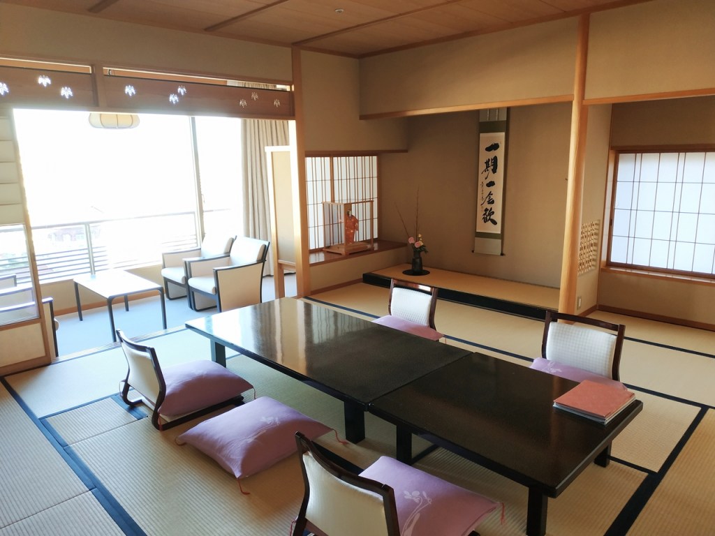 Nous avions réservé une grande chambre à l’hôtel Wakamizu, un ryokan réputé pour son élégance, son onsen, et son emplacement sur la rive de la rivière Mukogawa. La chambre était vraiment belle et spacieuse, comprenant plusieurs pièces dont une salle de bain avec baignoire en bois hinoki (cyprès japonais).