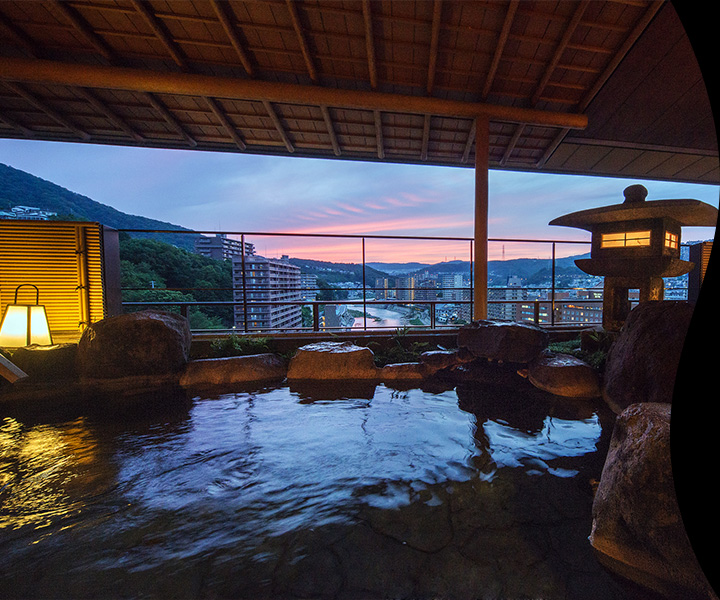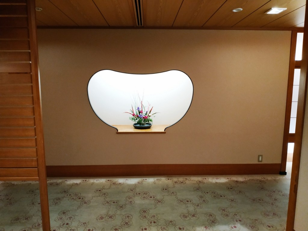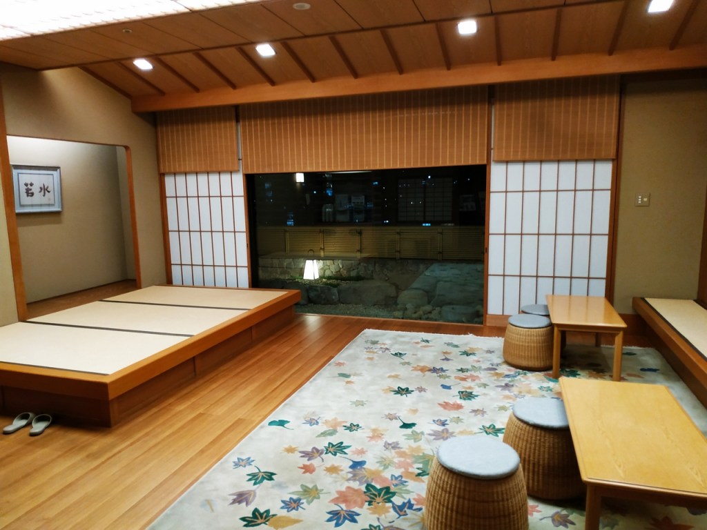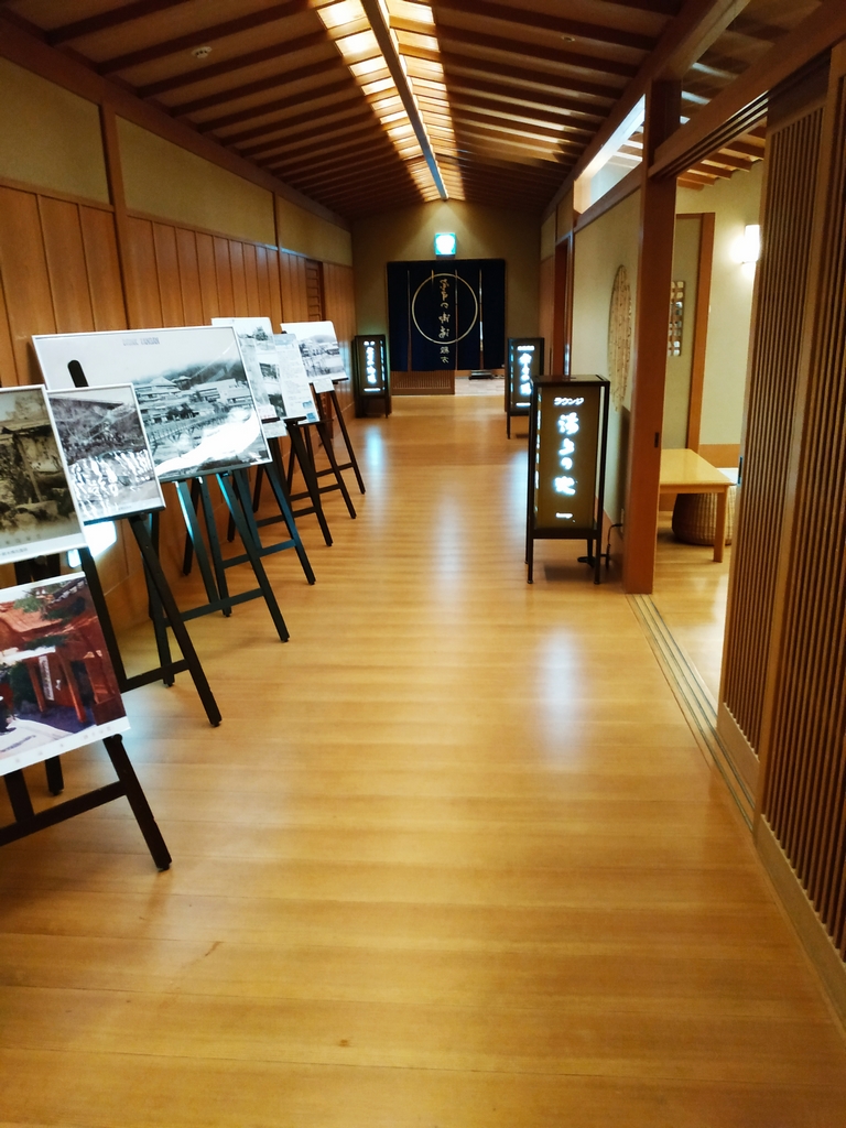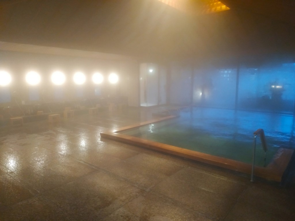 Le soir, direction le onsen dans les étages supérieurs de l’hôtel. Les couloirs sont très agréables, décorés à l’occasion des fêtes de fin d’année. Des photos anciennes de l’hôtel y sont exposées. J’ai eu la chance de m’y retrouver seul un petit moment où j’ai pu prendre une photo du grand bain, mais la photo du bain extérieur est celle du site de l’hôtel. Dans ce bain extérieur flottaient une bonne trentaine de yuzu qui parfumaient idéalement l’endroit, comme le veut la coutume au moment du solstice d’hiver.