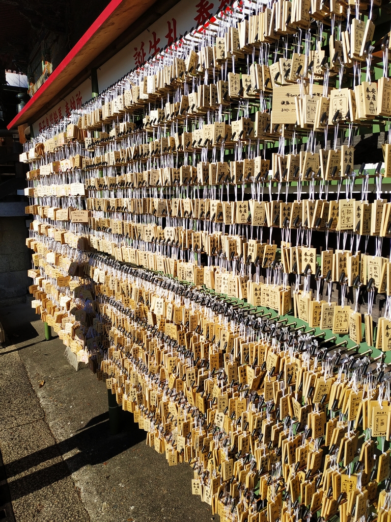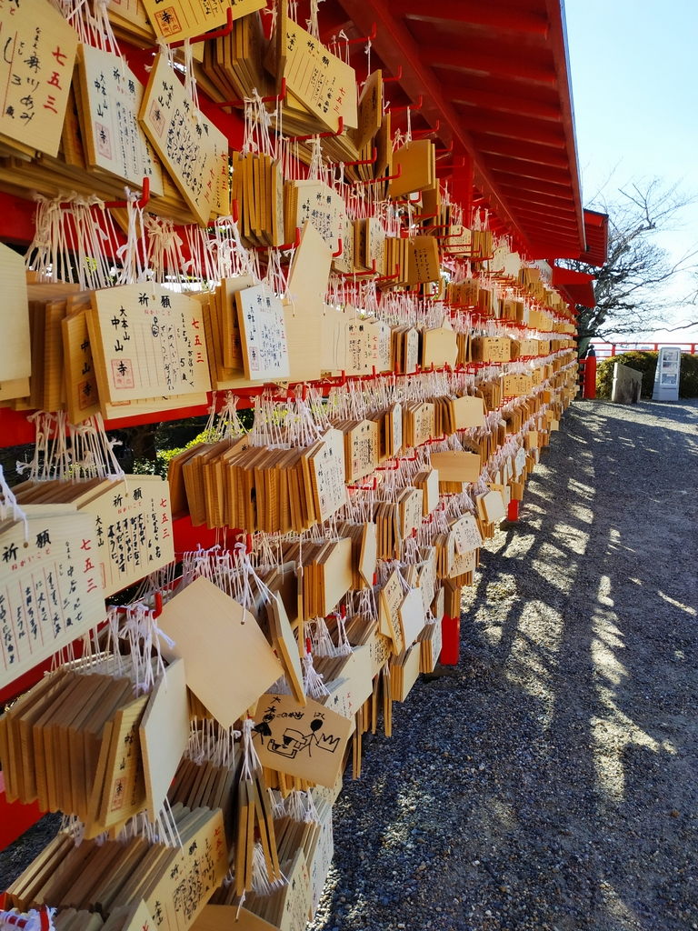 Ma femme y avait acheté un hara-obi (une ceinture sacrée pour le ventre), et nous sommes donc allés le rendre au temple car tout s’est bien passé ! Nous avons reçu en échange un omamori qui protège notre fils, et une petite plaquette de bois (avec son nom et sa date de naissance) à suspendre dans l’enceinte du temple.